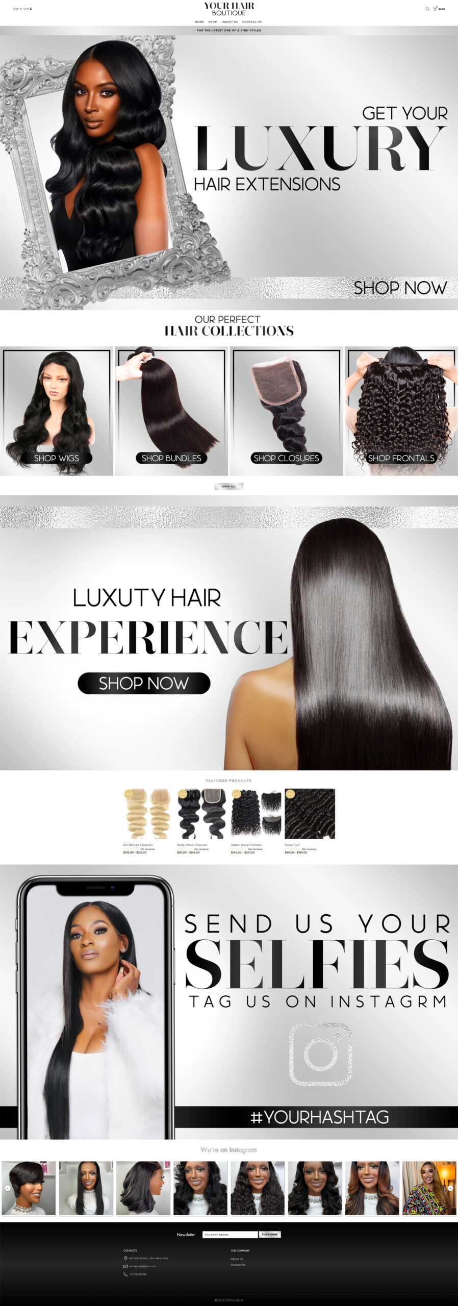 A luxury and elegant silver website design for hair businesses. A professional and sophisticated template for Shopify and Wix.