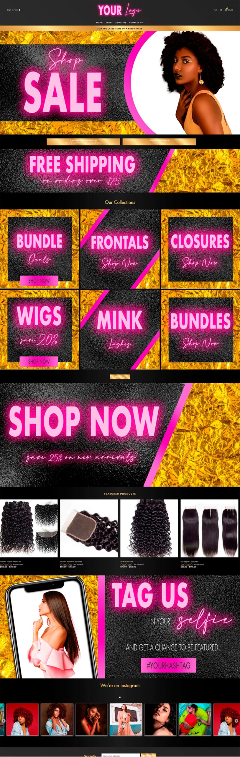 Make a bold statement with our neon pink and gold website template. Perfect for modern hair, beauty, and cosmetics online stores.