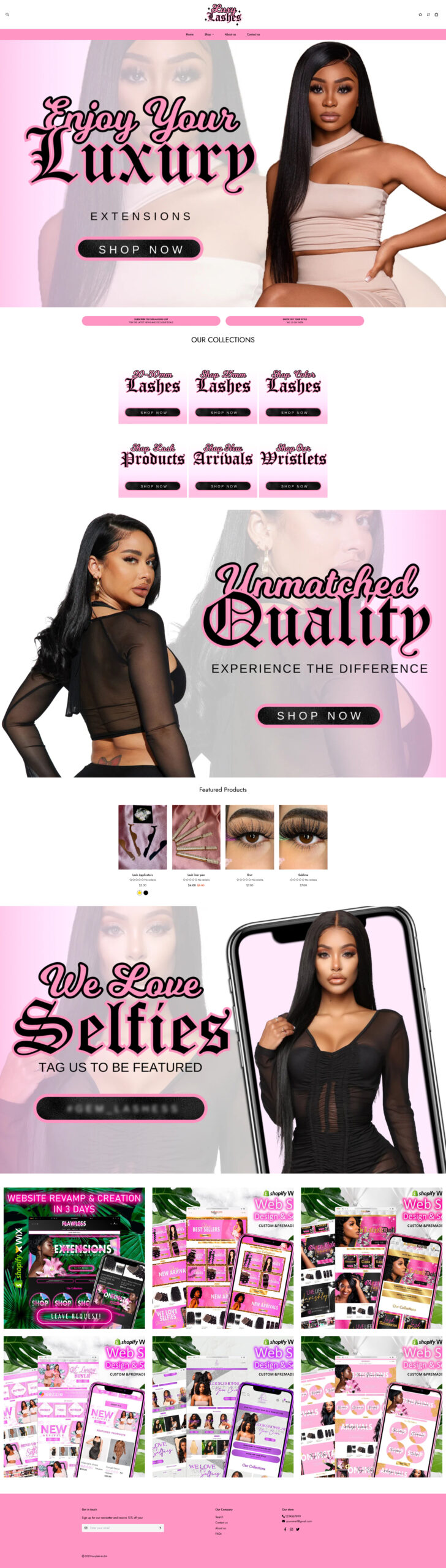 A trendy pink premade website for lash stores, makeup artists, and hair boutiques. A fun and stylish eCommerce design.